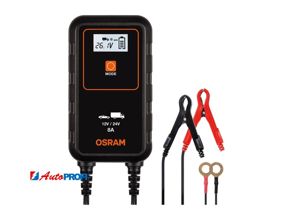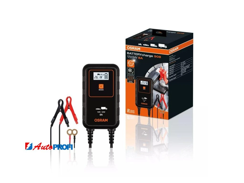 Inteligentní nabíječka s udržovacím režimem baterie, s vícestupňovým nabíjecím cyklem OSRAM BATTERYcharge 908 je inteligentní nabíječka s udržovacím módem baterie 8 A pro 12 V a 24 V vozidla, včetně většiny osobních, dodávkových a malých nákladních vozidel.