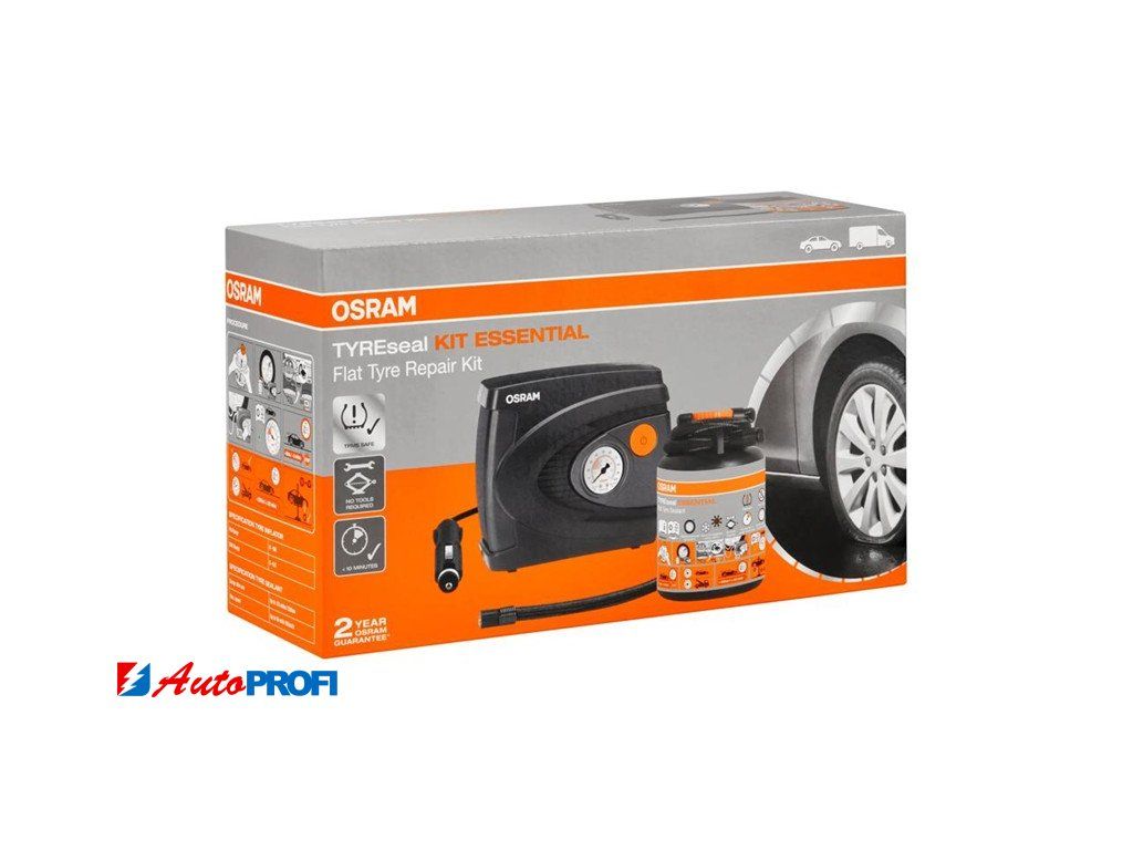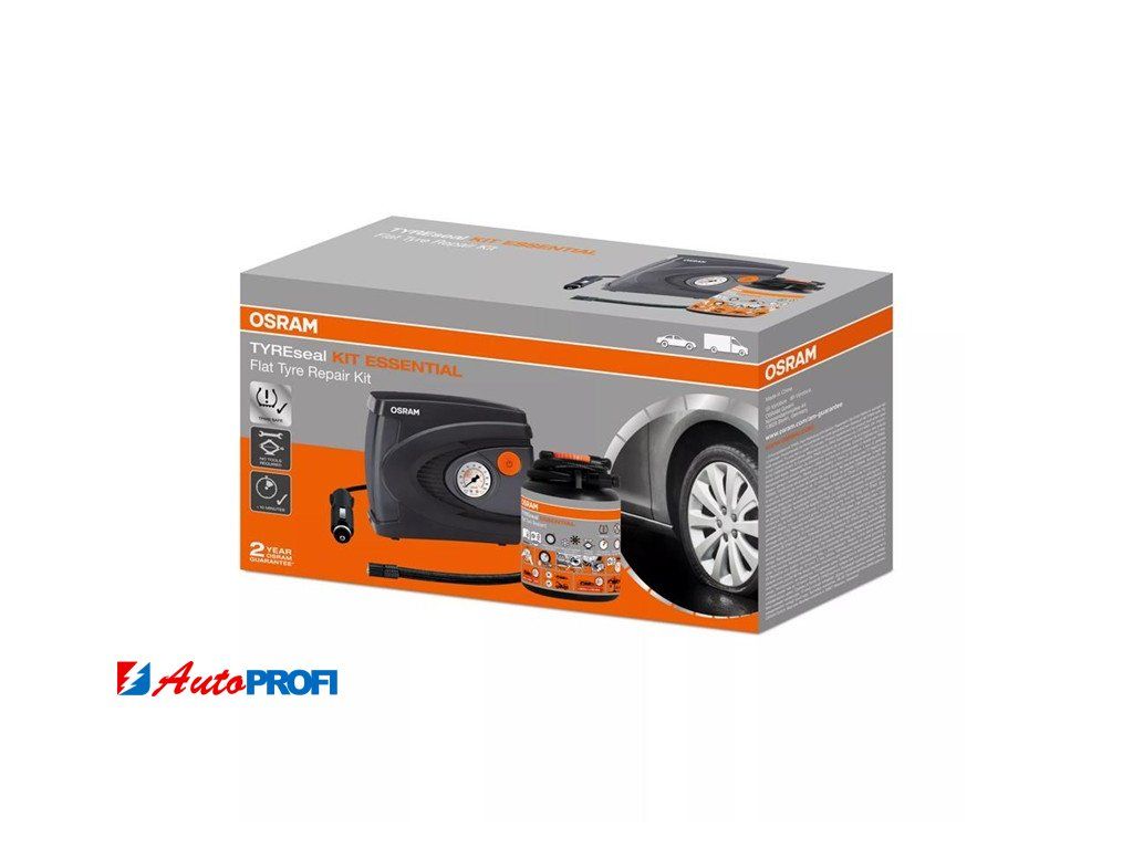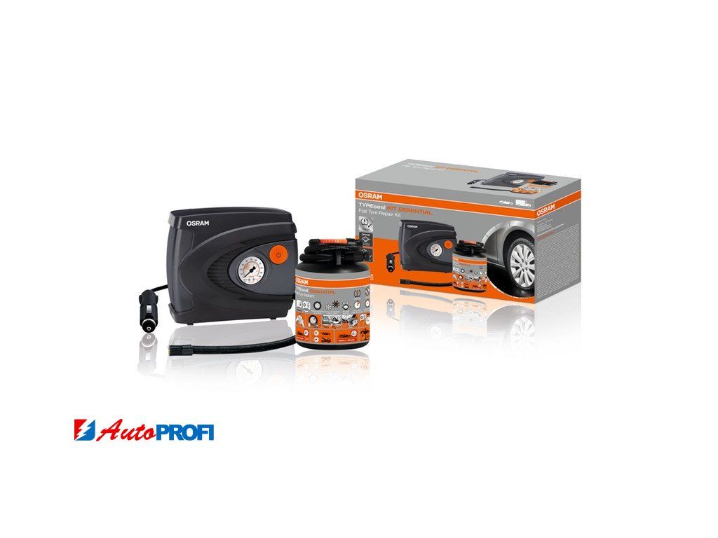 OSRAM TYREseal KIT ESSENTIAL obsahuje 450 ml lahvičku s těsnicím prostředkem na pneumatiky a prémiový analogový kompresor.