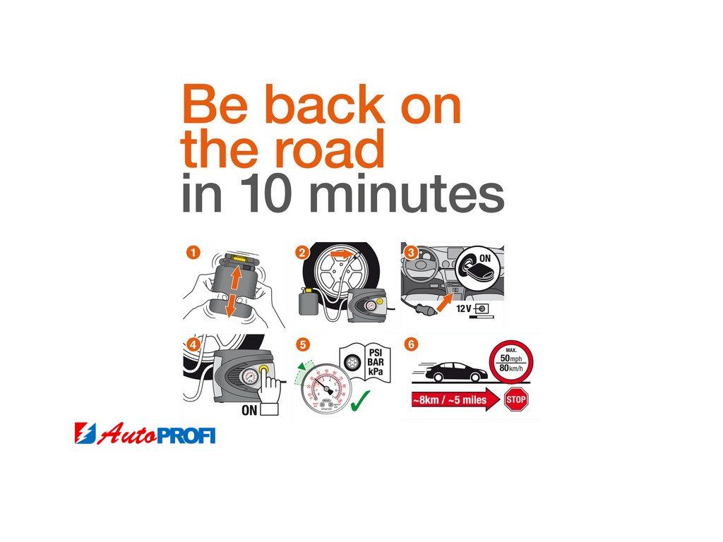 Bez potřeby nářadí nebo zvedáků je proces opravy propíchnuté pneumatiky rychlý a snadný a vrátí vás na silnici do 10 minut.