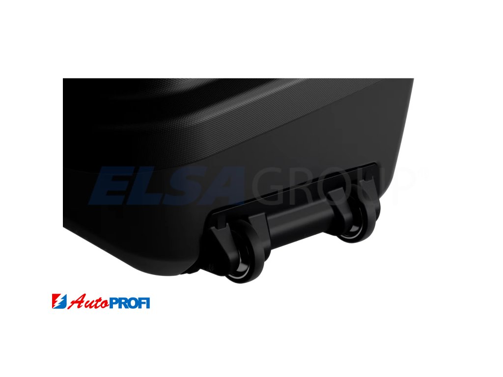 Box Thule Santu je umístěn nízko nad zemí, což zaručuje snadné nakládání a vykládání bez námahy. Dvě robustní kolečka a ergonomická rukojeť umožňují jeho hladké přesouvání na místo a pomocí sklápěcího mechanismu nosiče kol získáte snadný přístup do kufru vozidla.