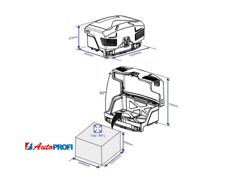 - Rozměry: 1200 x 670 x 650 vnější / 1040 x 500 x 520 vnitřní (Délka x šířka x výška v mm).