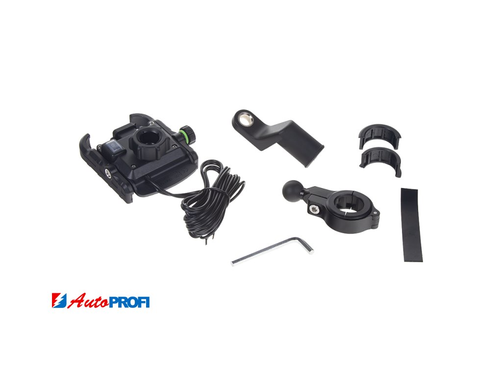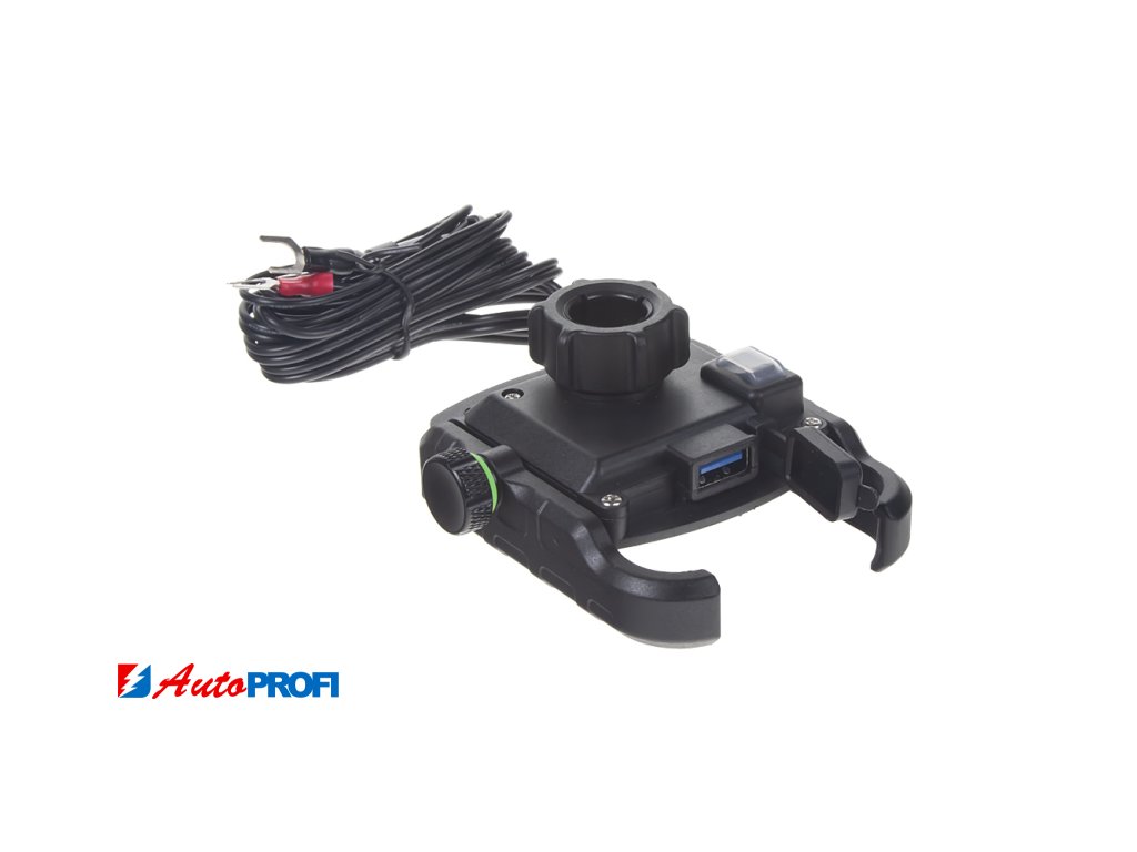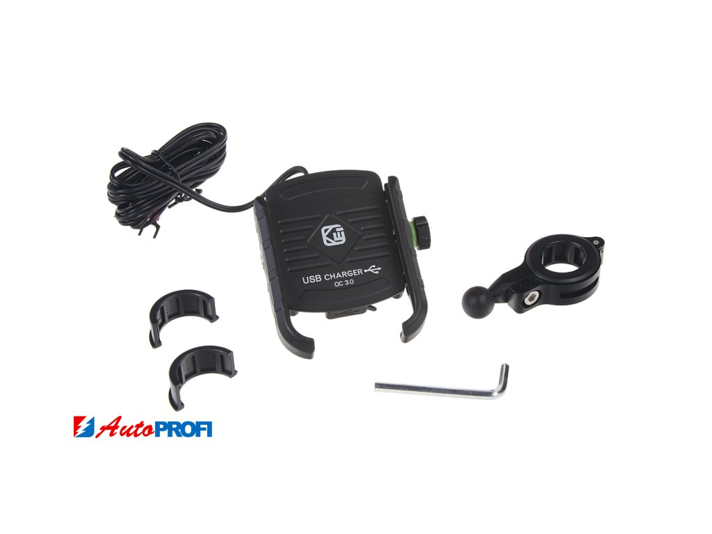 Univerzální hliníkový nastavitelný držák na trubku nebo na přišroubování pro mobilní telefony s USB nabíječkou, vhodný především pro použití na motocyklech a jízdních kolech.