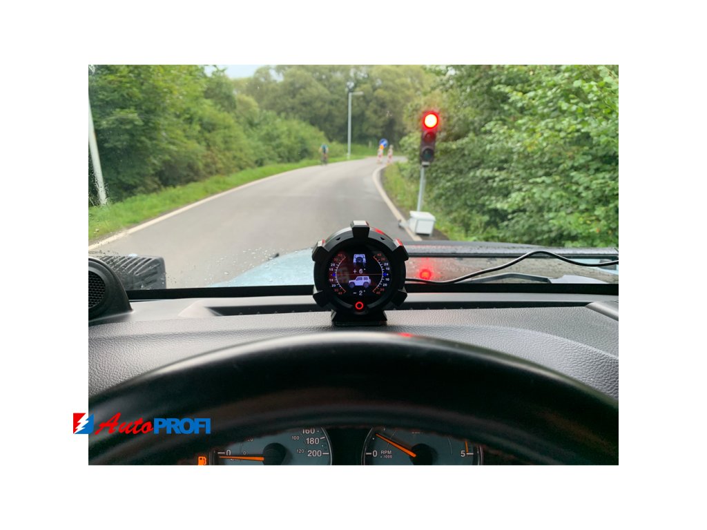 Palubní displej, s vestavěným víceosým gyroskopem a GPS systémem, který dokáže měřit sklon a náklon,