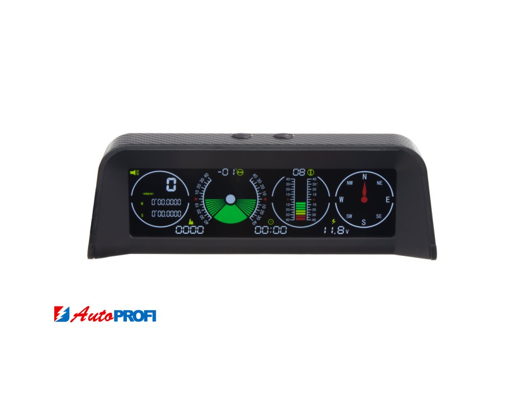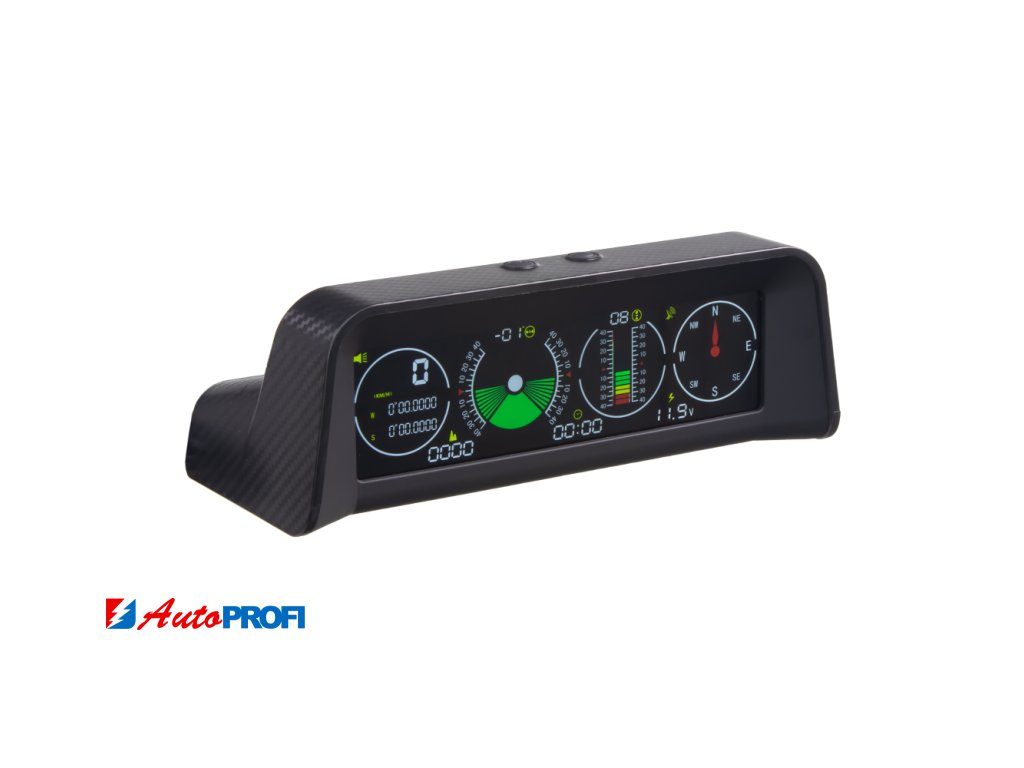 Palubní displej s vestavěným víceosým gyroskopem a GPS systémem, který dokáže měřit sklon a náklon, stupeň sjezdu a stoupání vozidel během jízdy, zeměpisné šířky a délky zobrazuje údaje o rychlosti, napětí baterie a další údaje na přehledném barevném LCD displeji.