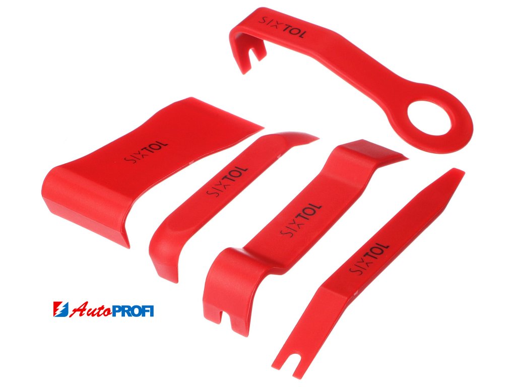 Účelná sada speciálních nástrojů k demontáži čalounění SIXTOL TRIM SET 1. Sada obsahuje 5 speciálních nástrojů k demontáži částí interiéru v automobilech, karavanech, lodích apod. Nástroje mají speciálně tvarované profily na demontáž vnitřních a vnějších příchytek plastových a čalouněných částí interiéru, k odstraňování dveřních panelů, vodících lišt a ozdobných pásů, interiérových panelů a palubní desky, okenních výlisků, výlisků průduchů klimatizace, na bezpečnou demontáž krytů kol, apod. Díky jejich tvaru nedojde poškození laku vozu, čalounění a pochromování.Obsah sady: