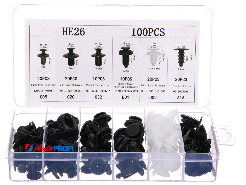 Tato praktická sada obsahuje příchytky a kolíky o 100 kusech pro čalounění vozidel. Jsou ideálním pomocníkem pro všechny profiesionály i domácí kutily při opravě nebo údržbě vozu. Sada je vybavena 6 druhy komponentů o různých velikostech a tvarech, čímž se stává univerzální pro širokou škálu vozidel. Všechny komponenty jsou přehledně uspořádány v prakitckém plastovém boxu, což usnadňuje jejich skladování a přepravu.Hlavní výhody: