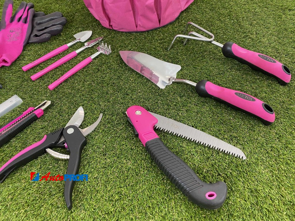 Praktická 10dílná sada zahradního nářadí GARDEN PINK pro každého zahrádkáře. Snadný přenos nářadí v brašně s kapsami a vodotěsným vnitřkem, který poslouží i jako kýbl na vodu, hlínu, odpad ze záhonu nebo cokoli dalšího. Součástí sady jsou také zahradní rukavice a čtyři plastové „drápy“, se kterými je možné snadno vydloubnout plevel z hlíny nebo vyhrabat důlek v záhonu. „Drápy“ chrání vaše nehty a prsty před poraněním o ostré kamínky a jiné ostré a tvrdé předměty v hlíně.Hlavní výhody: