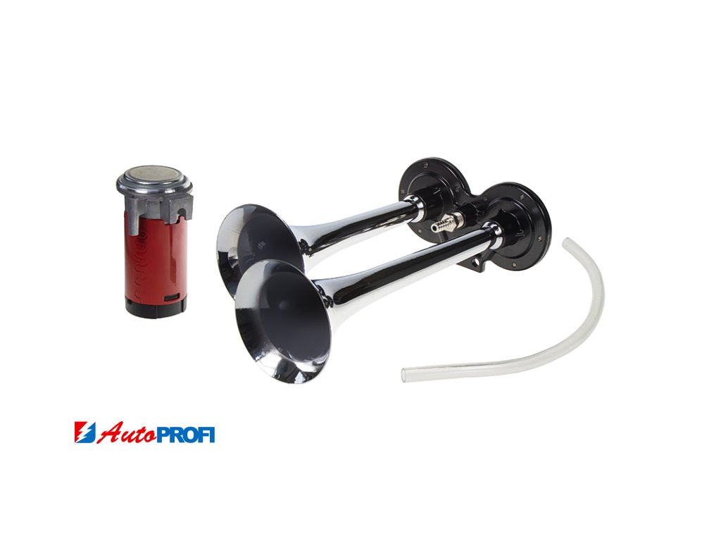 2-trubková fanfára poháněná vzduchovým kompresorem dodávaným v sadě.Trubky jsou pochromované. V sadě jsou dodávány také hadice a drobný montážní materiál.