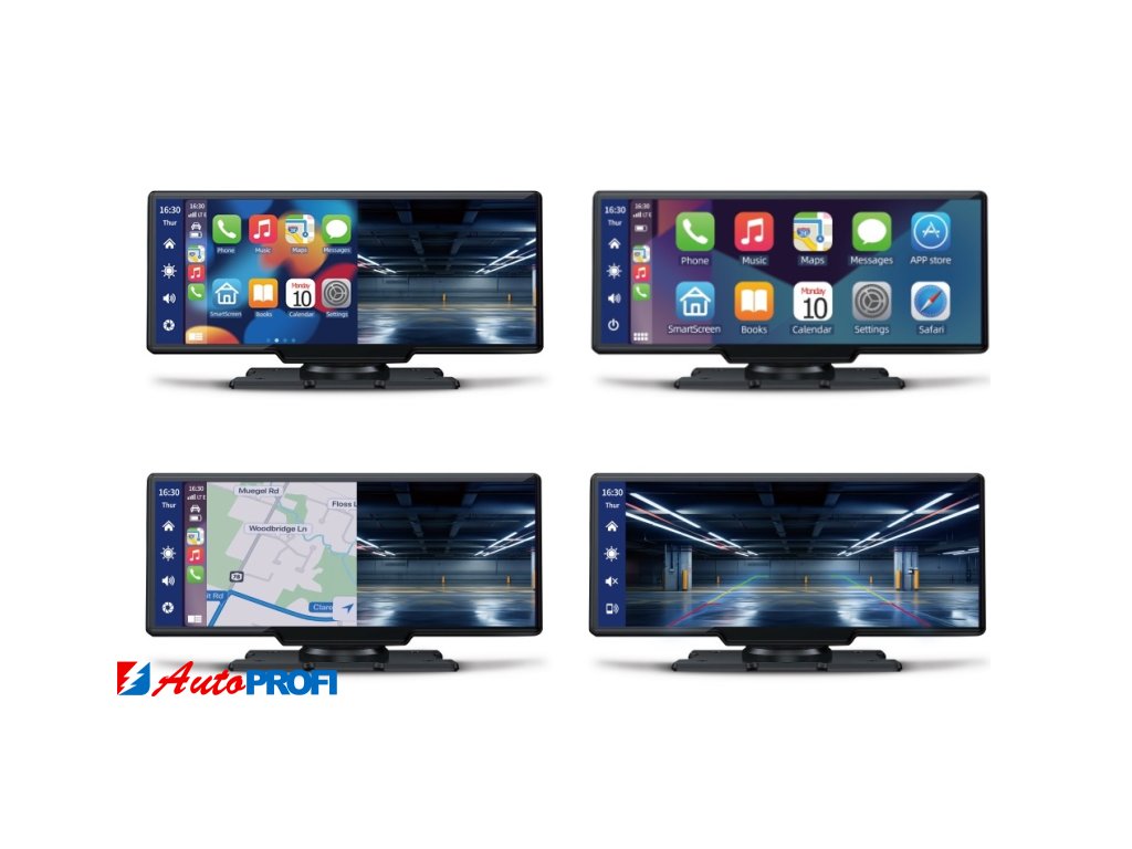 Dotykový monitor s úhlopříčkou 10" bezdrátově zrcadlí Apple CarPlay / AndroidAuto z Vašeho telefonu a integruje audio / videofunkce na přístrojovou desku vozidla. Funkce parkovací kamery, DVR nahrávání 2K / FHD, navigace a sms naleznete tak na jednom místě, přičemž máte stále přehled o situaci před vozidlem. Řízení je tak bezpečnější a pohodlnější. Výhodou je možnost využívat i věrné zrcadlení telefonu displeje AndroidCast / AppleAirplay, které umožní např. přehrávání videa, Youtube, O2tv nebo dalších internetových TV.
