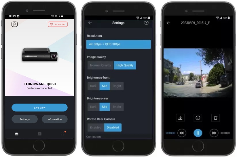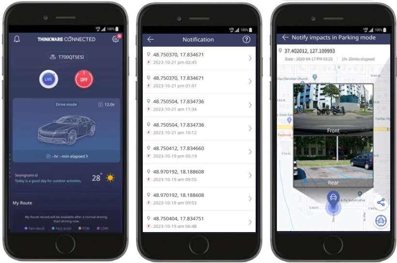 Pro přidání Wi-Fi sítí do kamery a prvotní nastavení nahrávání použijete DASH CAM LINK aplikaci. Pro vzdálený přístup, nastavení notifikací, sledování historie jízd se využívá aplikace THINKWARE CONNECTED. Kamera se vždy připojí na internet přes Wi-Fi síť s nejlepším signálem.