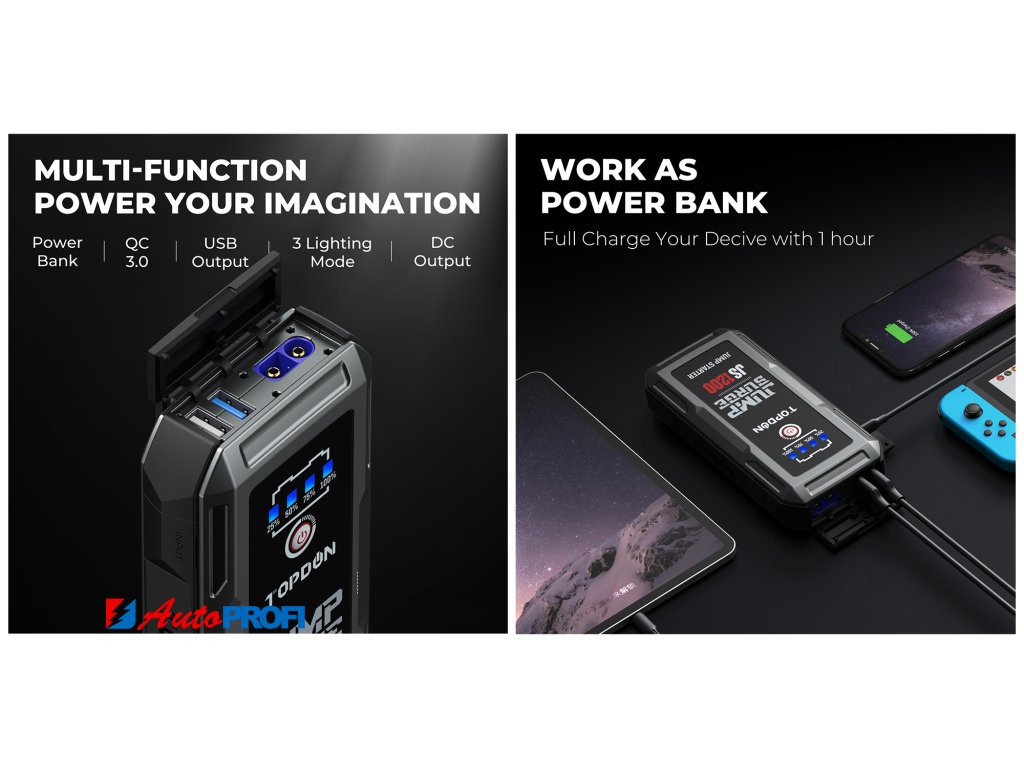 JumpSurge1200 slouží také jako powerbanka! Pomocí dvou USB-A výstupů a kompatibilního kabelu dokáže plně nabít váš smartphone, tablet a jakékoli kompatibilní elektronické zařízení. Navíc podporuje rychlé nabíjení za použití protokolu QC3.0. Dále JumpSurge 1200 podporuje nabíjení jakéhokoliv zařízení pomocí konektoru typu Jack s maximálním výkonem 16,8V/10A max.