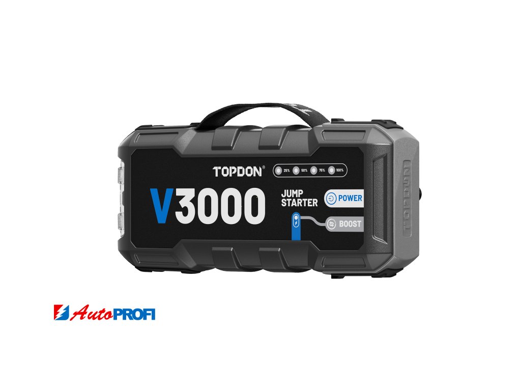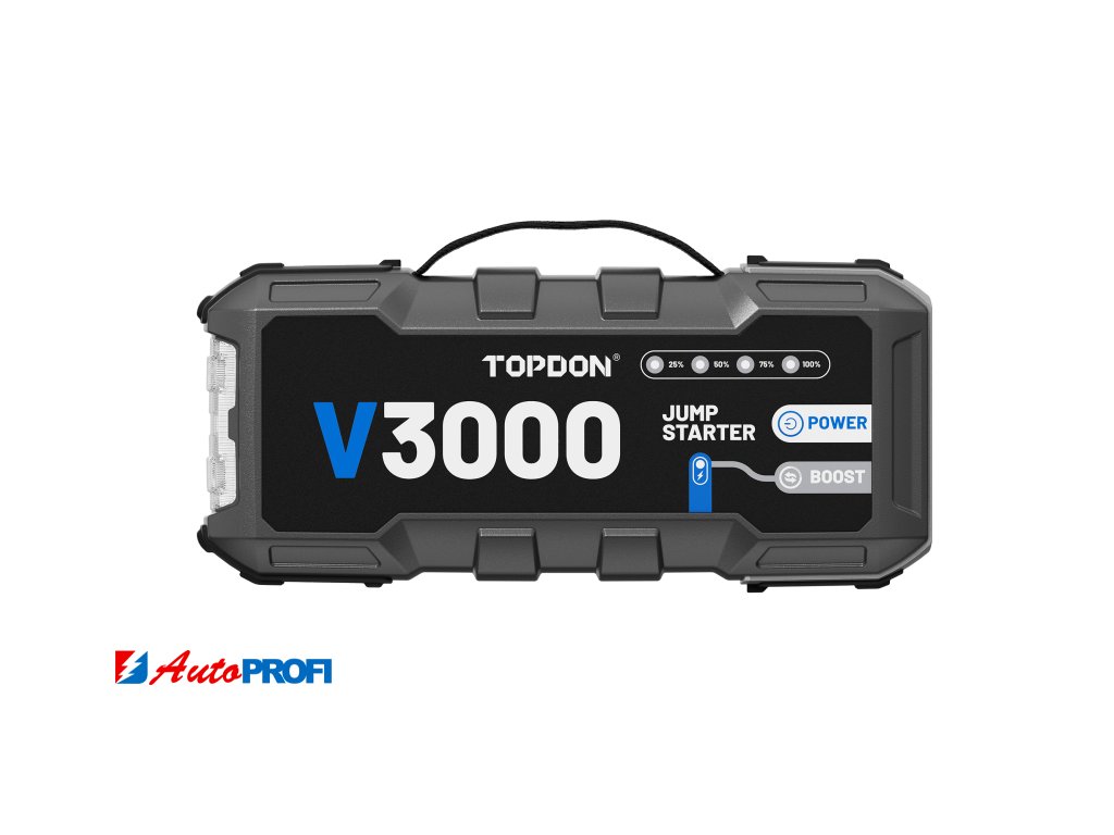 Startovací zdroj TOPDON V3000 je výkonově silný startovací booster a powerbanka v jednom je navržen pro náročné podmínky a vozidla s 12 V systémem (osobní auta, SUV, pick-upy, menší nákladní vozidla). Disponuje špičkovým proudem až 3000 A, díky čemuž spolehlivě nastartuje benzínové motory až 9,0 l a naftové až 7,0 l.