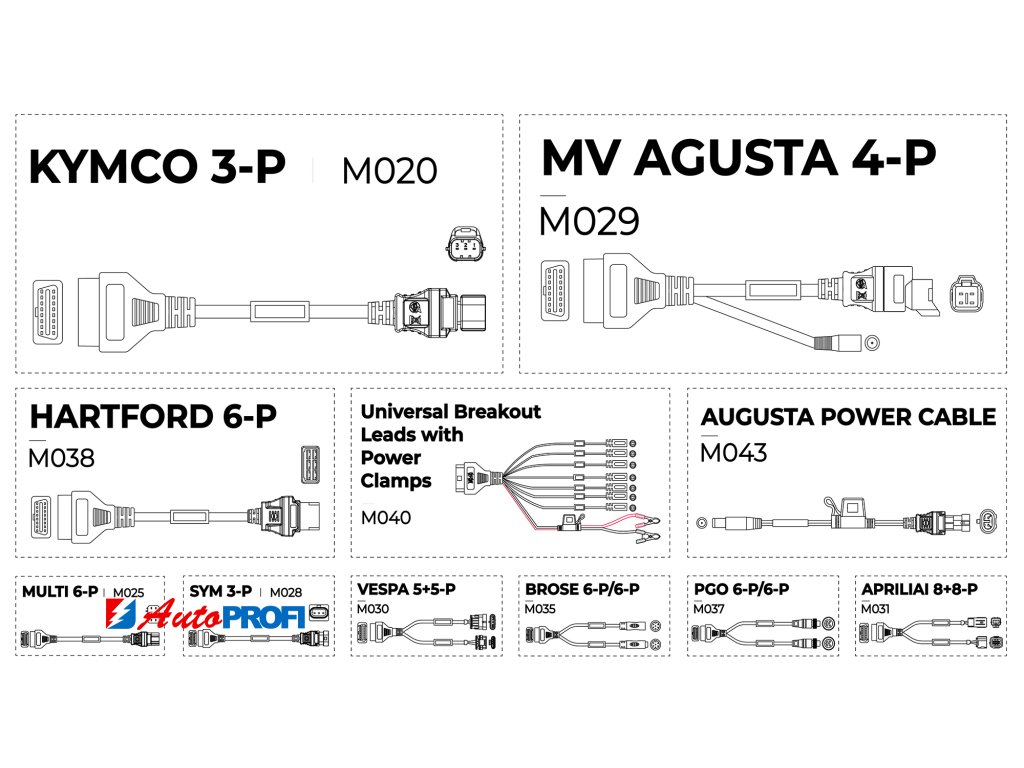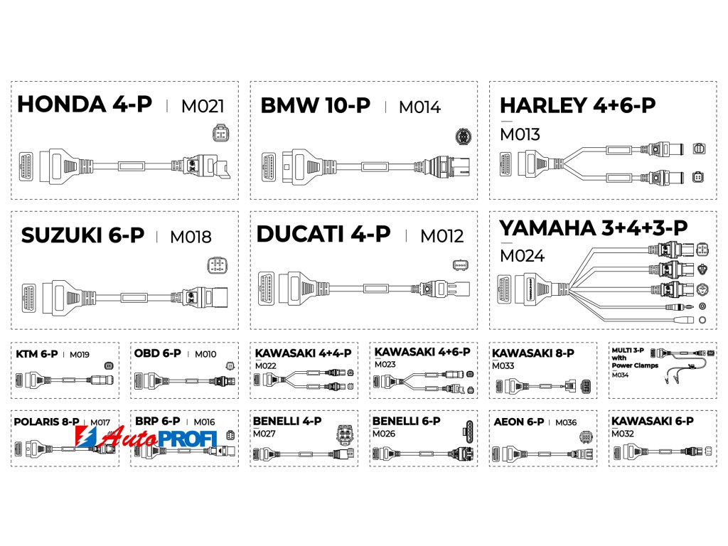 Honda 4-P (M021), BMW 10-P (M014), Harley 4+6-P (M013), Suzuki 6-P (M018), Ducati 4-P (M012), Yamaha 3+4+3-P (M024), KTM 6-P (M019), OBD 6-P (M010), Kawasaki 4+4-P (M022), Kawasaki 4+6-P (M023), Kawasaki 8-P (M033), Multi 3-P with Power Clamps (M034), Polaris 8-P (M017), BRP 6-P (M016), Benelli 4-P (M027), Benelli 6-P (M026), Aeon 6-P (M036), Kawasaki 6-P (M032), Kymco 3-P (M020), MV Agusta 4-P (M029), Hartford 6-P (M038), Universal Breakout Leads with Power Clamps (M040), Augusta Power Cable (M043), Multi 6-P (M025), Sym 3-P (M028), Vespa 5+5-P, Brose 6-P/6-P (M035), PGO 6-P/6-P (M037), Apriliai 8+8-P (M031)