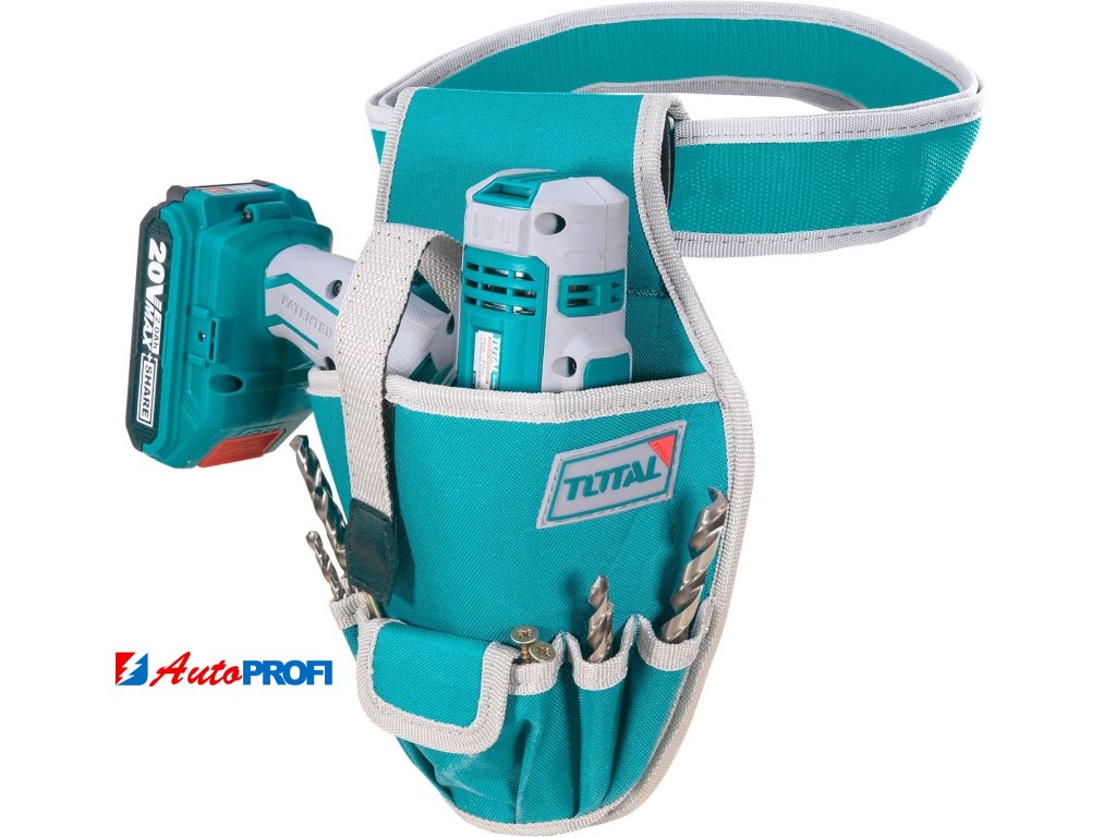 Kvalitní pás na nářadí od značky TOTAL-TOOLS s jednou velkou kapsou na AKU vrtačku a 5 menšími předními kapsami pro šroubováky a vrtáky. Obsahem balení je také nastavitelný opasek s přezkou pro nošení v pase. Pás je vyrobený z odolného 600D polyesteru, který zaručuje jeho dlouhou životnost.Technické parametry: