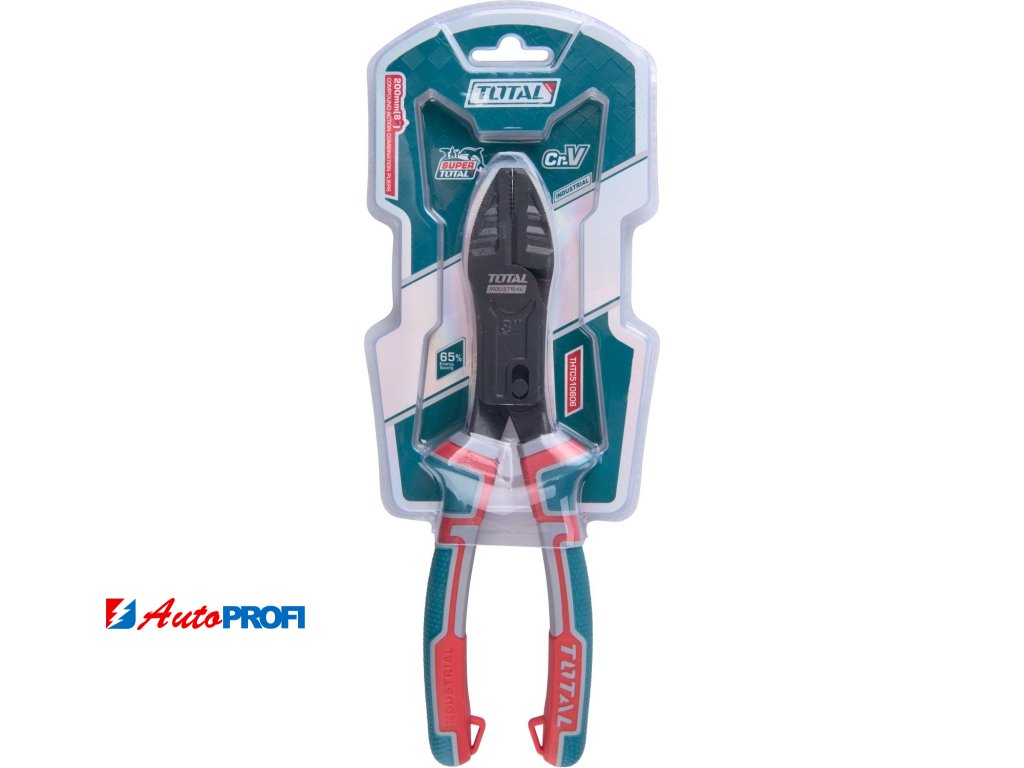 Velikost: 200 mm, Úspora energie 65% než běžné kleště, Materiál: Cr-V, Povrchová úprava: teflonový povlak, TPR tříbarevná rukojeť pro pevné uchopení a pohodlí S funkcí držáku na hřebíky, S funkcí klíče, S funkcí odhrotování, Baleno v polovičním dvojitém blistru.Technické parametry: