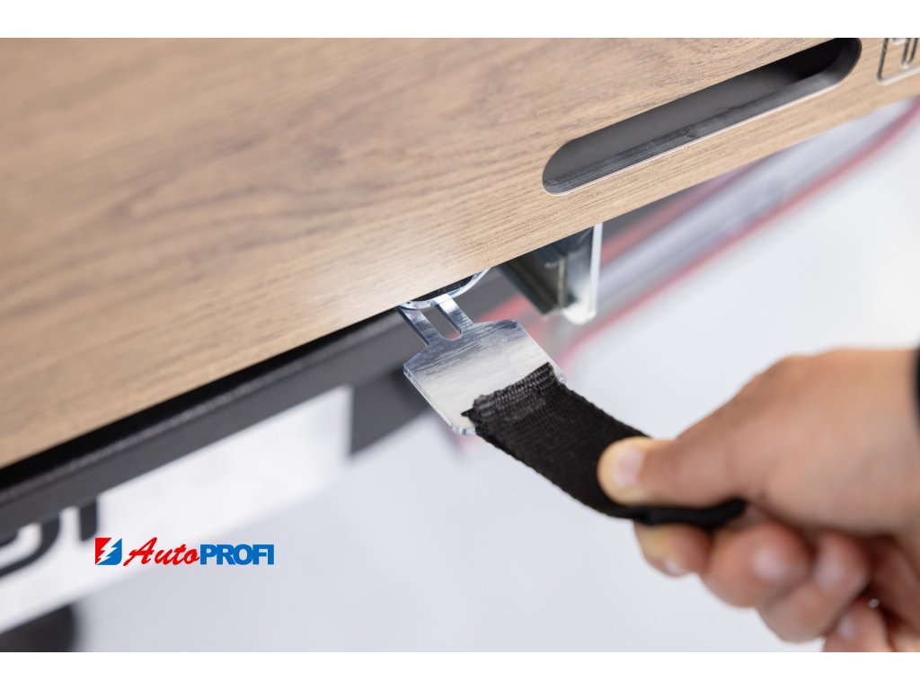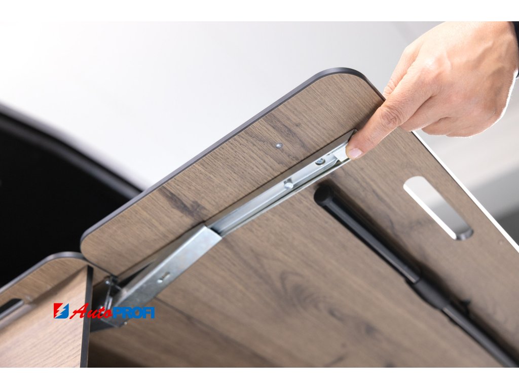 Balení obsahuje: skříňku z dřevěného kompozitu, ocelové kolejnice, panty a nožičku pro nastavení sklonu nosiče zavazadel.
