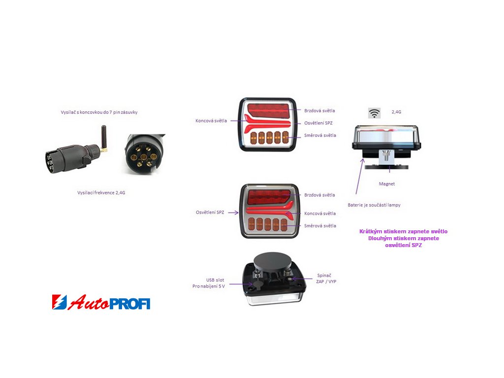 2x sdružená aku lampa zadní LED s bezdrátovým připojením k 7 pin zástrčce.