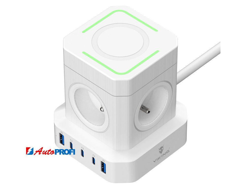 Viking ACT45W kombinuje pět výkonných USB portů (3× USB-C a 2x USB-A), čtyři AC zásuvky a 2m prodlužovací kabel v jednom kompaktním adaptéru, který umožňuje současné napájení až 10 zařízení.