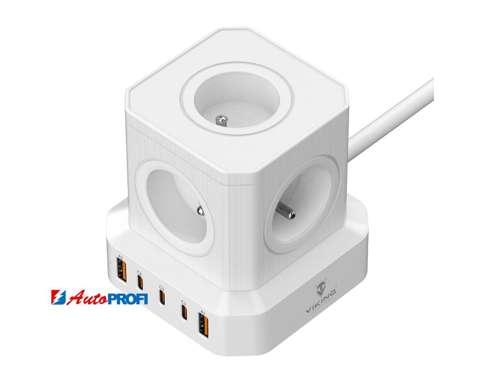Viking ACT55 kombinuje pět výkonných USB portů (3× USB-C a 2x USB-A), pět síťových zásuvek a 2m prodlužovací kabel v jednom kompaktním adaptéru, který umožňuje současné napájení až 10 zařízení.