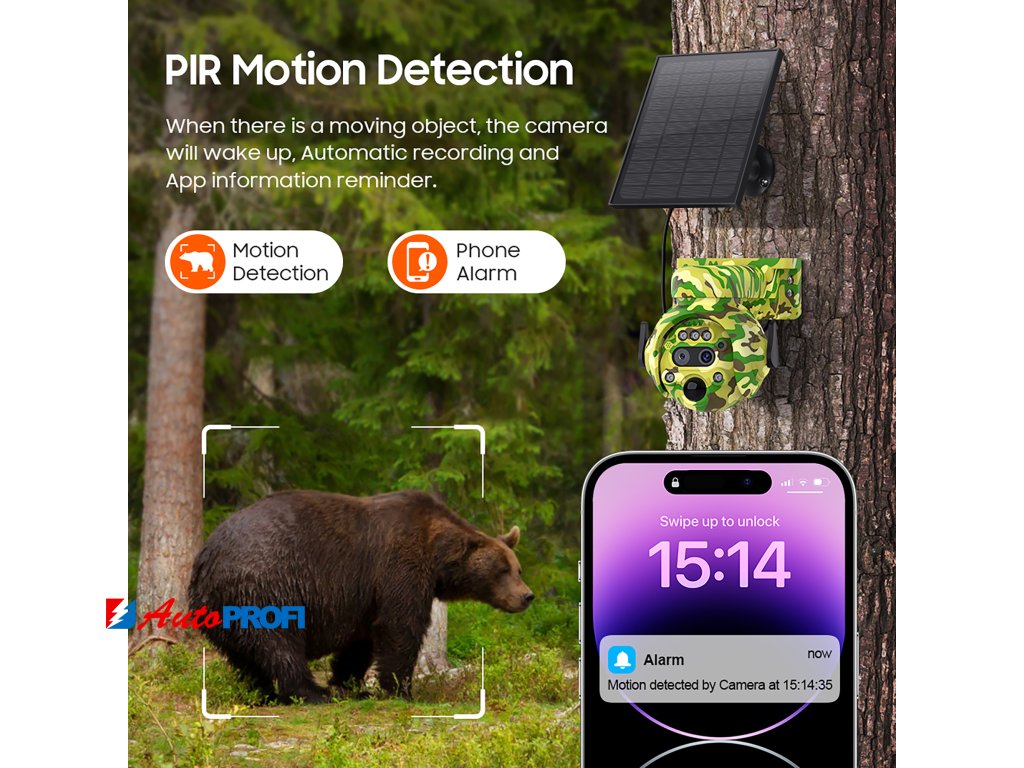 - Pokročilá detekce pohybu: PIR senzor s dosahem 0-12 metrů spolehlivě detekuje lidi a automaticky spustí alarm, který vás okamžitě upozorní na neobvyklé aktivity.