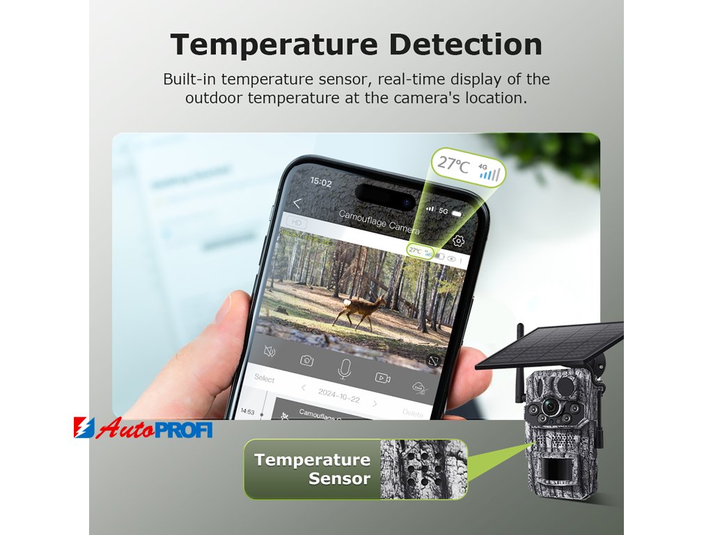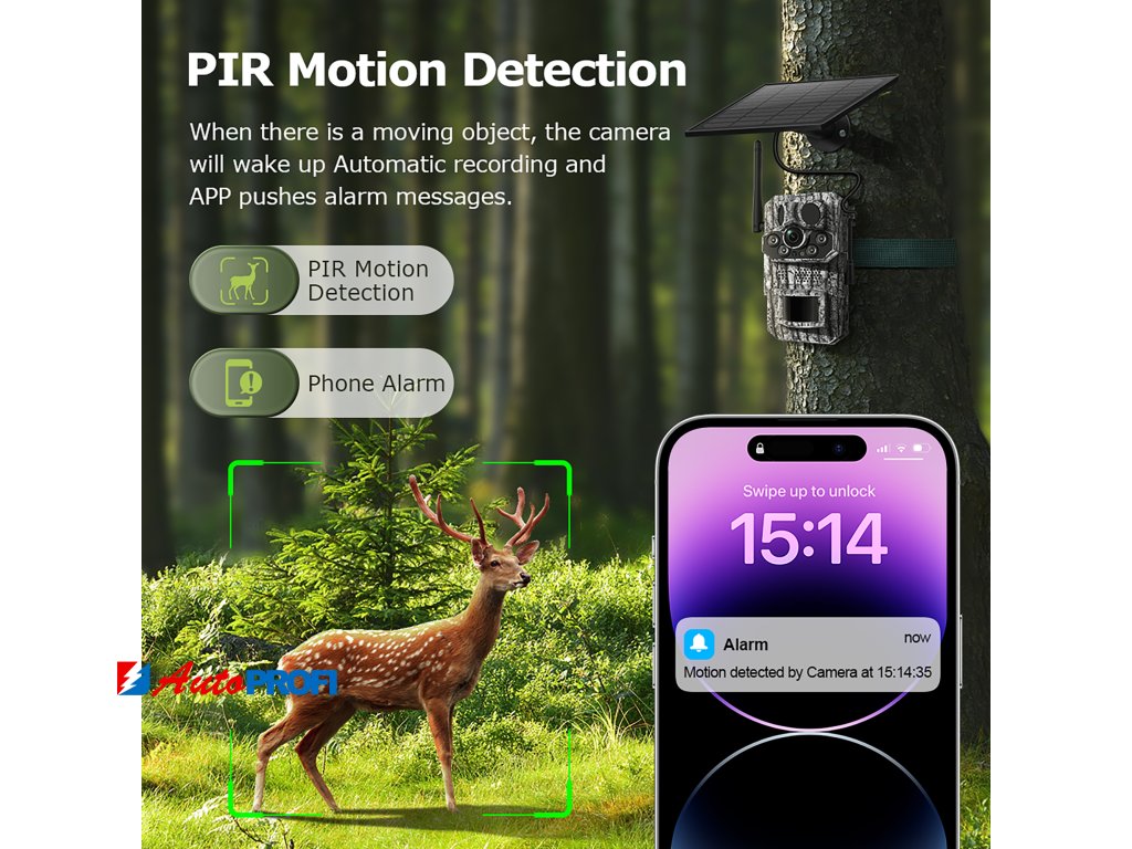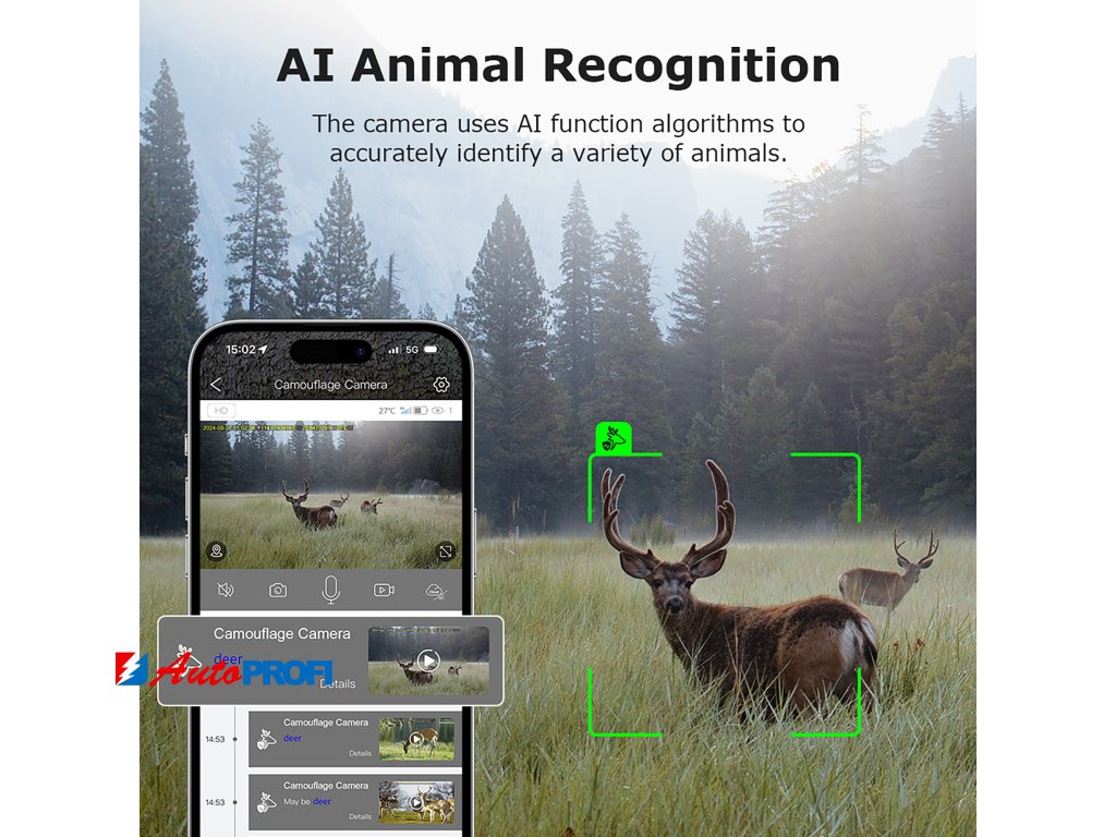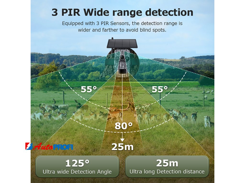 Kamera je vybavena PIR senzorem, který spolehlivě detekuje pohyb až na vzdálenost 20 metrů. Navíc disponuje funkcí detekce teploty a rozpoznávání zvířat s AI.