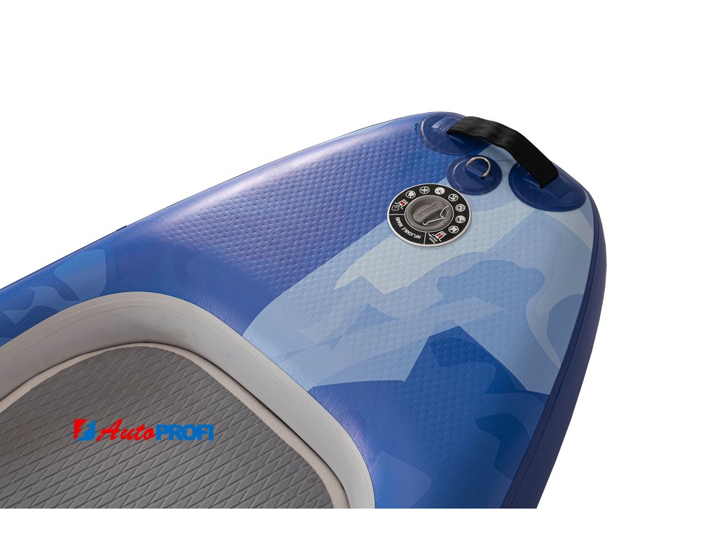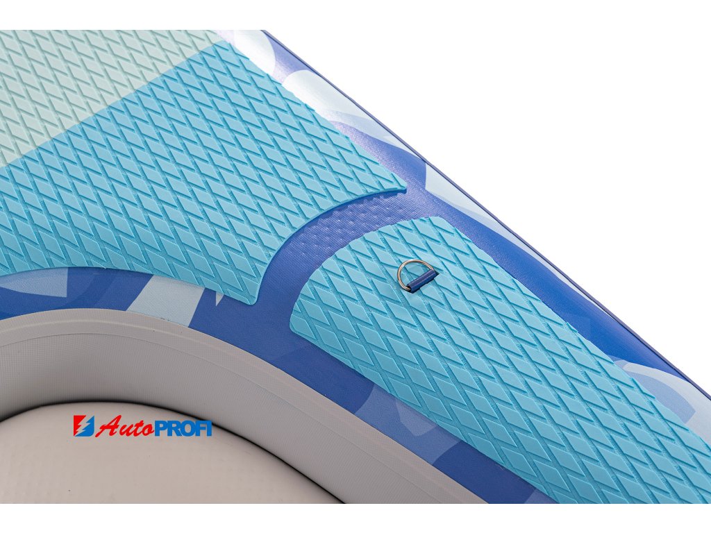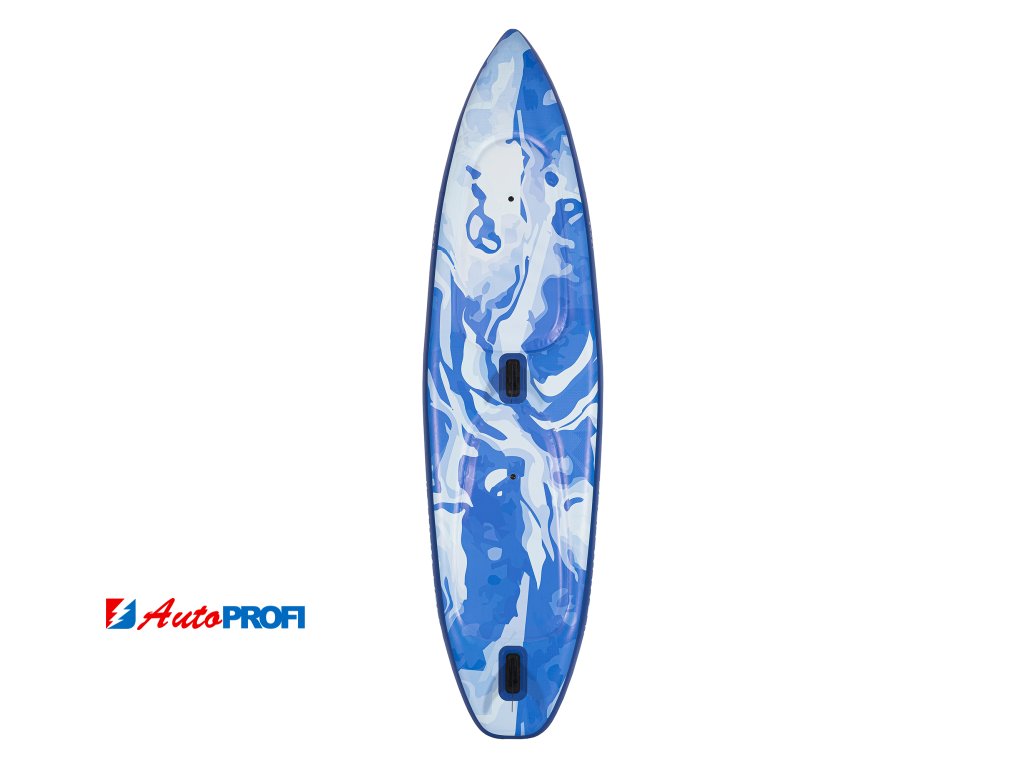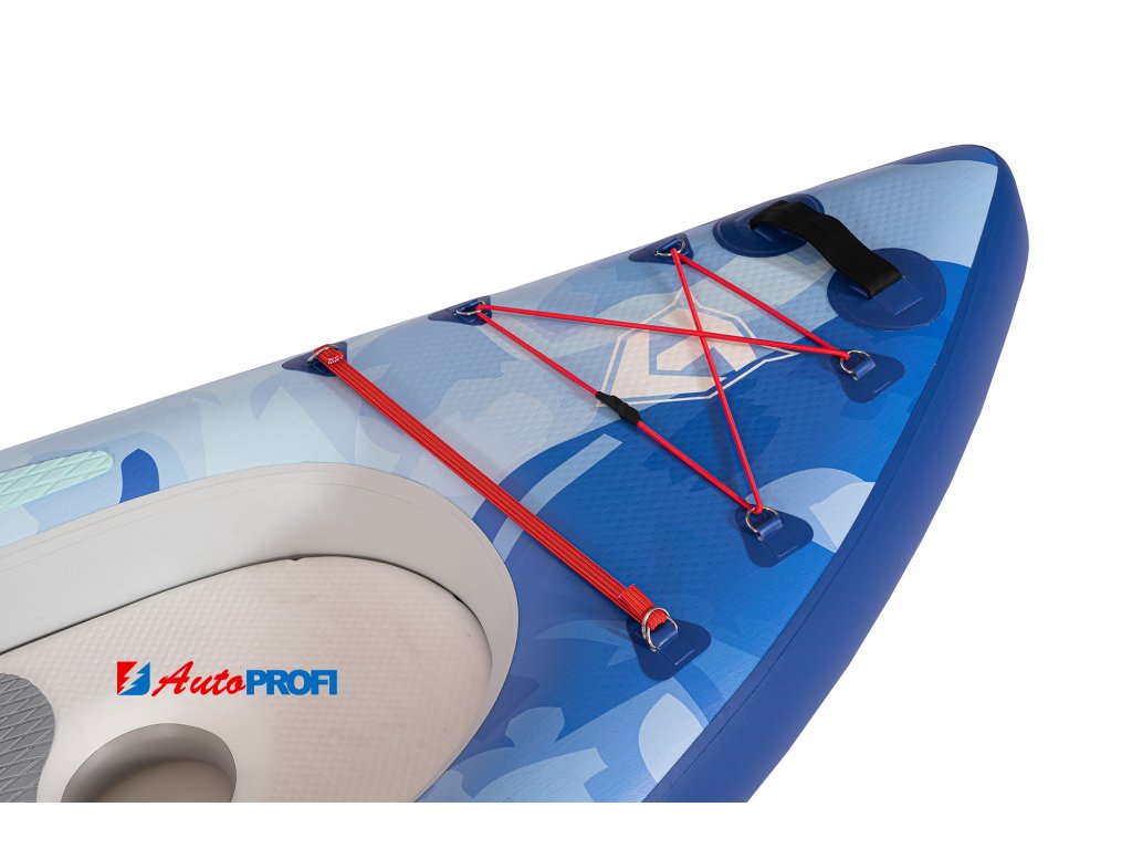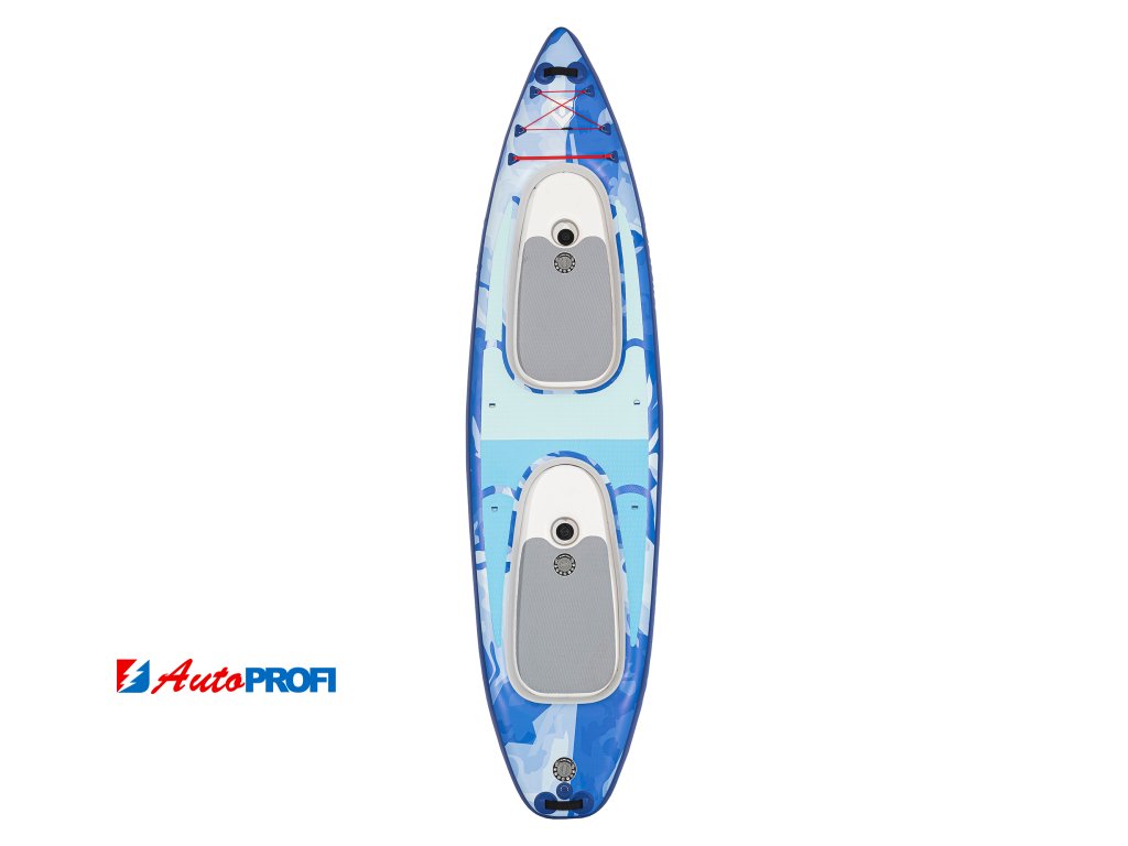 Kajak zaujme výrazným vodním motivem v odstínech modré, který připomíná pohyb vln a dokonale ladí s vodním prostředím. Je vybaven integrovaným sedacím prostorem určeným pro dva jezdce. Spodní strana obsahuje dvě ploutve, které zajišťují lepší stabilitu a snadnější ovládání během jízdy.