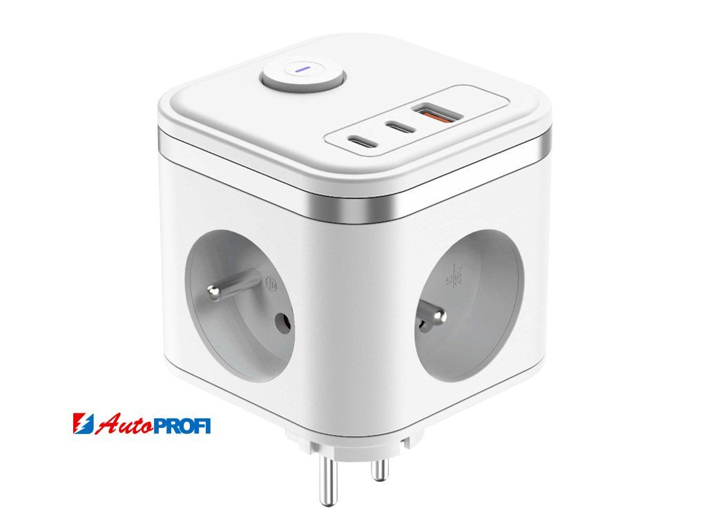 Síťový adaptér VIKING Y33 kombinuje 3 AC výstupy a 3 USB porty, což umožňuje nabíjení až 6 zařízení současně. Díky kompaktnímu designu a tlačítku ON/OFF je používání snadné a přehledné.