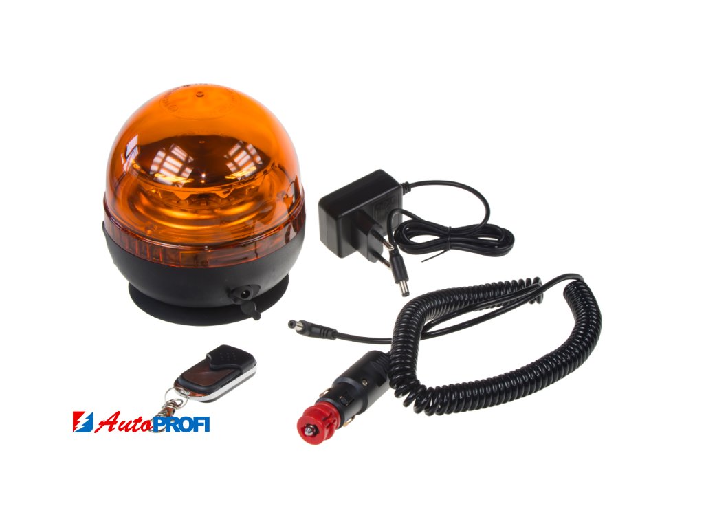 Akumulátorový nabíjecí výstražný oranžový maják s LED technologií a zábleskovým režimem s možností ovládání pomocí dálkového ovladače. Určen pro uchycení pomocí magnetu.