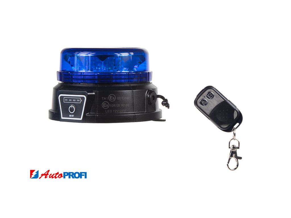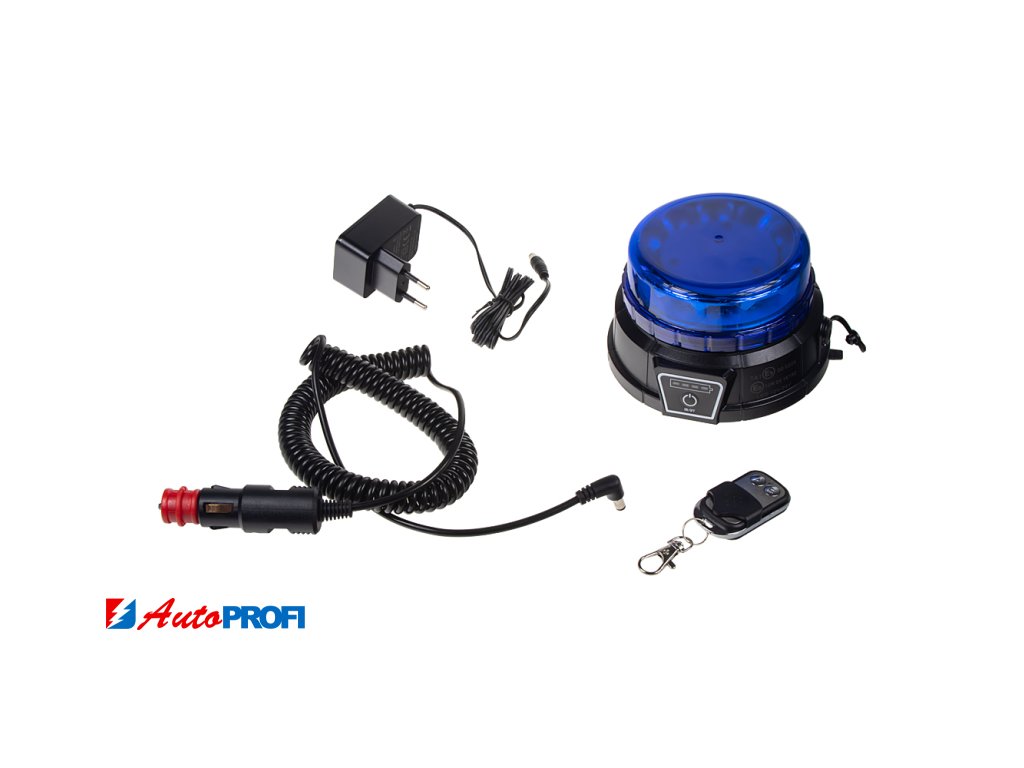 Akumulátorový nabíjecí výstražný modrý maják s LED technologií a třemi režimy blikání a s možností ovládání pomocí dálkového ovladače. Určen pro uchycení pomocí magnetu.