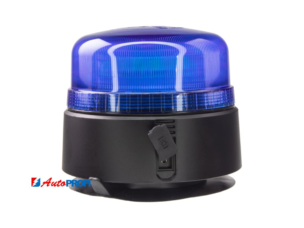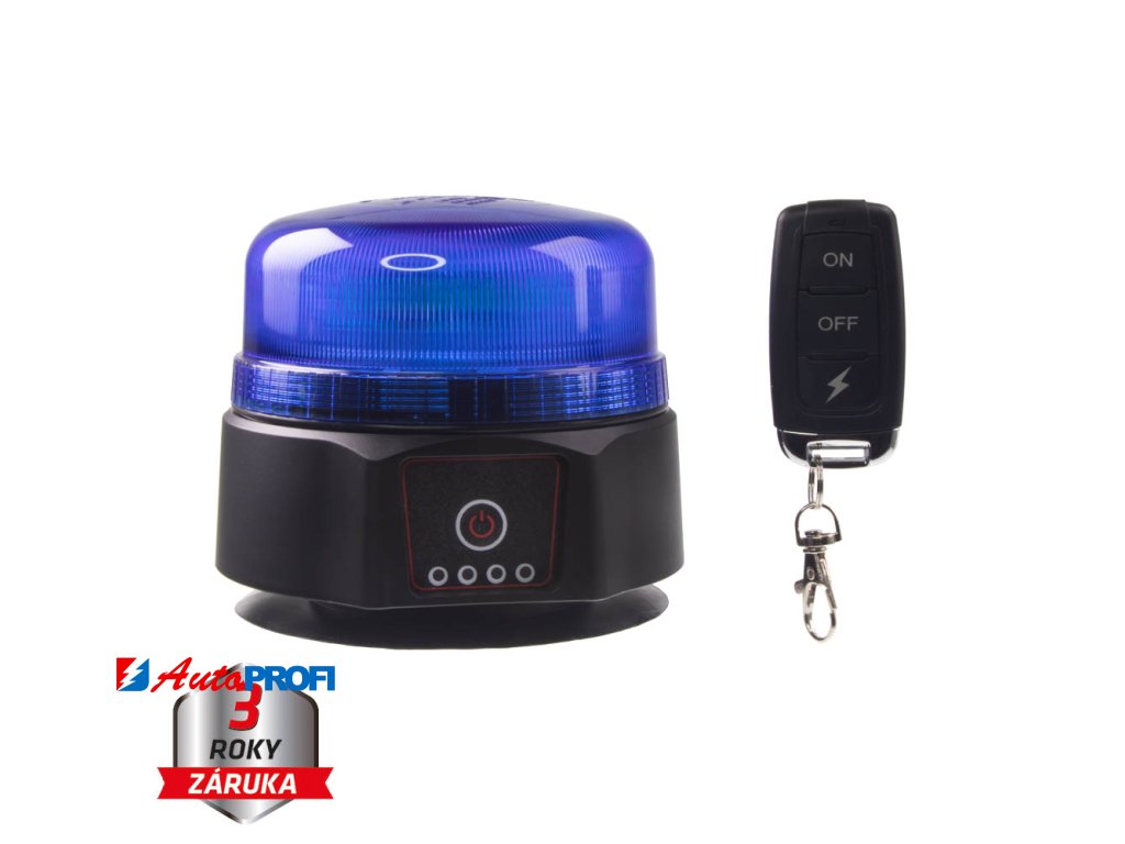 Akumulátorový nabíjecí výstražný modrý maják s LED technologií a 2 režimy blikání s možností ovládání pomocí dálkového ovladače. Určen pro uchycení pomocí magnetu.