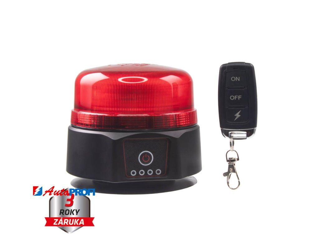 Akumulátorový nabíjecí výstražný červený maják s LED technologií a 2 režimy blikání s možností ovládání pomocí dálkového ovladače. Určen pro uchycení pomocí magnetu.